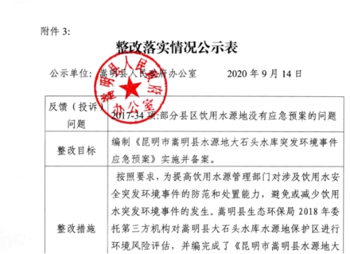 整改措施 | 按照要求,为提高饮用水源管理部门对涉及饮用水安全突发环境事件的防范和处置能力,避免或减少饮用水突发环境事件的发生。嵩明县生态环境局2018年委托第三方机构对嵩明县大石头水库水源地保护区进行环境风险评估,并编完成了《昆明市嵩明县水源地大石头水库突发环境事件应急预案》,2020年8月10日经县政府印发实施,并进行了备案。 |