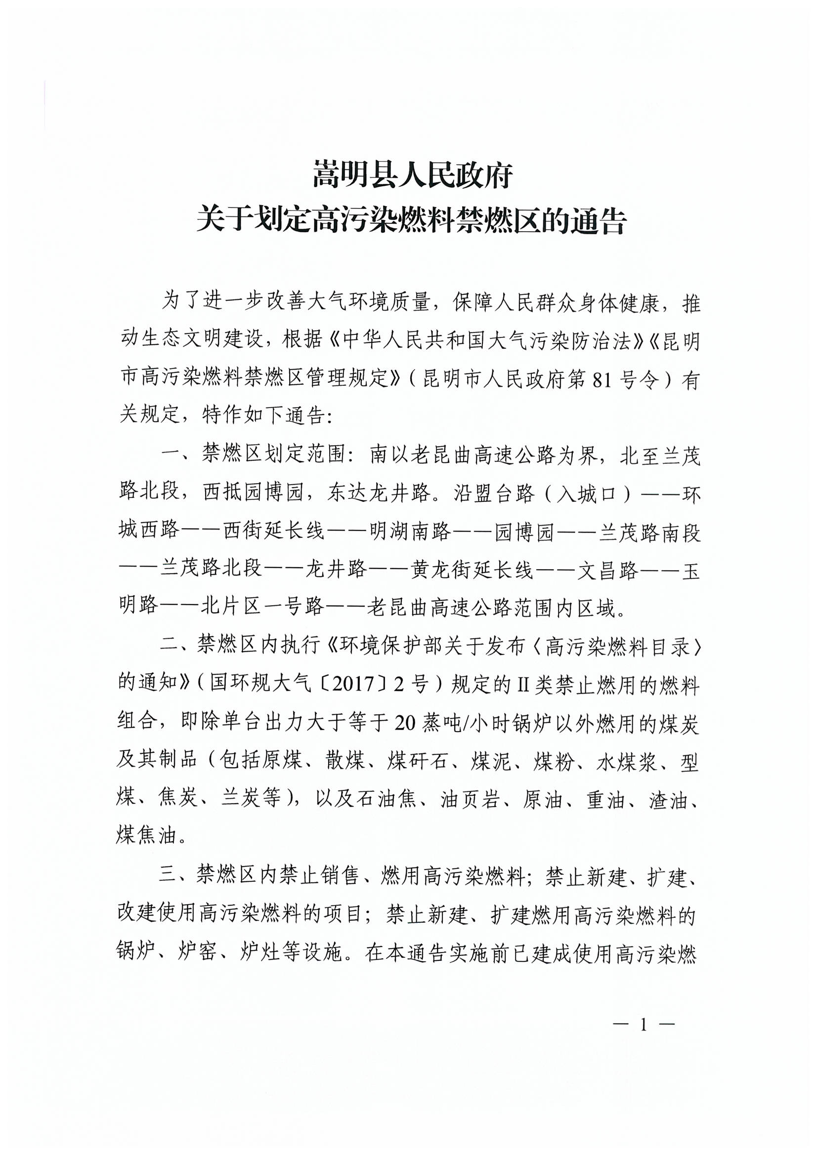 嵩明县人民政府关于划定高污染燃料禁燃区的通告