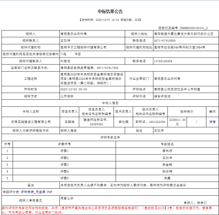 嵩明县2020年中央财政资金高标准农田建设项目(第二标段:保旺村)中标结果公示