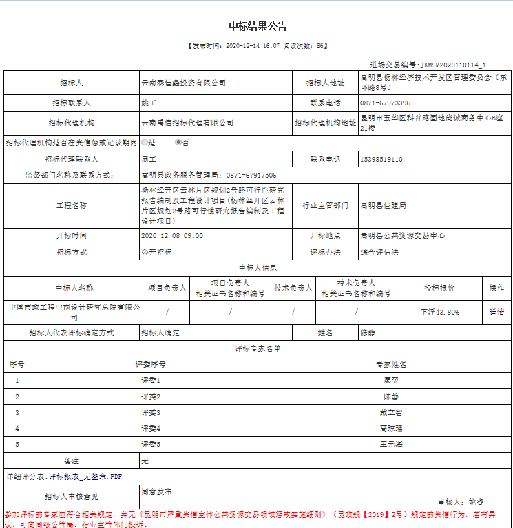 杨林经开区云林片区规划2号路可行性研究报告编制及工程设计项目(中标结果公示)
