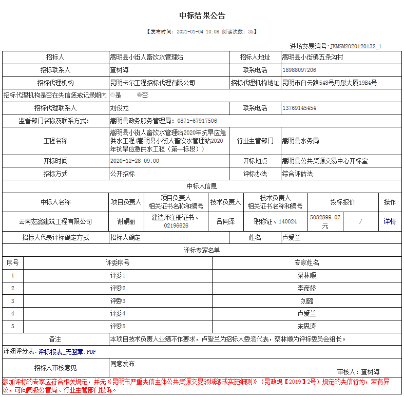 嵩明县小街人畜饮水管理站2020年抗旱应急供水工程(第一标段)(中标结果公示)