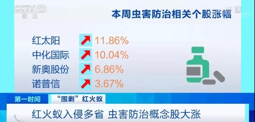 受红火蚁入侵我国多个省份消息的影响,近期,A股市场虫害防治相关概念股涨幅较大,其中,红太阳、中化国际本周的涨幅分别达到11.86%和10.04%,新奥股份、诺普信的涨幅也在3%以上。