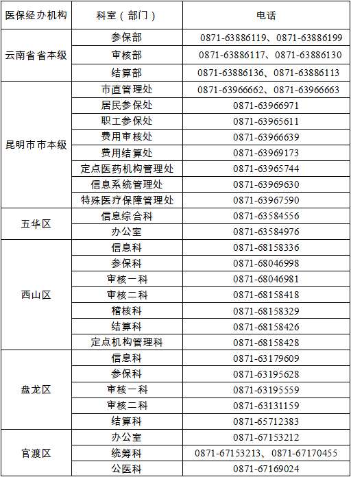 尊敬的省本级、昆明市医疗保险参保人: 为深入贯彻落实党中央、国务院关于深化医疗保障制度改革的决策部署,进一步加快医疗保障信息化建设,向参保人提供更加便捷高效的医保服务,根据国家医疗保障局统一安排部署,省本级、昆明市(以下统称昆明地区)将统一上线使用国家医疗保障信息平台,为确保新老信息平台的顺利切换和平台切换期间参保人的待遇不受影响,现就有关事项公告如下: 一、昆明地区医保信息平台切换停机时间为2021年11月20日0时至12月4日24时,新的国家医疗保障信息平台于12月5日0时开机运行。 二、停机期间,参保人(含离休干部)持社会保障卡、医保电子凭证到定点医药机构就医购药,将不能通过医保信息平台进行费用结算,请参保人根据自身疾病治疗需要,在11月20日前合理备足停机期间所用药品,确保治疗不受影响。请各定点医药机构根据参保人的病情,在保证用药安全的前提下,满足参保人停机期间的用药需求。 三、停机期间参保人因病情需要产生的涉及统筹基金报销的门诊费用,可先行垫付,后续到参保地医保经办机构进行手工报销。 四、在省内定点医疗机构住院的参保人,11月20日前符合出院条件的,正常办理出院结算;仍需继续住院治疗的,定点医疗机构退出医保入院登记,平台上线运行后重新办理医保入院手续,并由医疗机构将期间的住院医疗费用进行补录结算。在停机期间需要住院的,正常办理住院手续,平台上线运行后由定点医疗机构办理入院手续,并将期间的住院医疗费用进行补录结算。 五、在省外异地定点医疗机构住院的参保人,11月20日前符合出院条件的,正常办理出院结算;仍需继续住院治疗或停机期间办理住院的,出院时个人先行垫付费用,后续到参保地医保经办机构进行手工报销。 六、停机期间,参保人需要到参保地经办机构服务大厅办理的业务,经办机构正常受理各项业务所需资料,待平台上线运行后及时办结。 七、系统切换期间,给广大参保人带来不便,敬请谅解。衷心感谢广大参保人对医疗保障工作的理解支持。 云南省医疗保障局 2021年11月11日 昆明地区医疗保障部门联系电话表如下