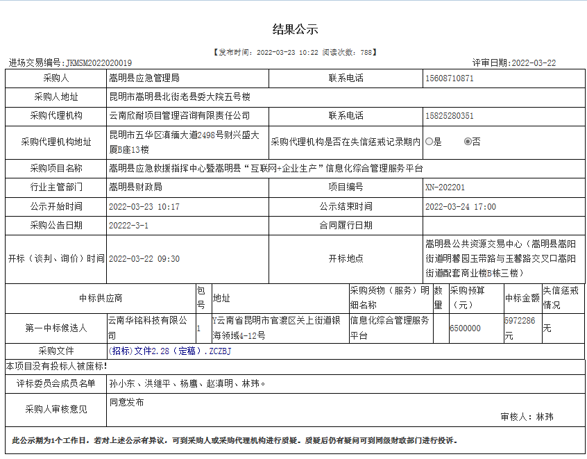 嵩明县应急救援指挥中心暨嵩明县“互联网 企业生产”信息化综合管理服务平台 (结果公示)