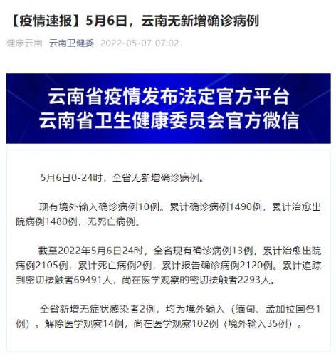 截至2022年5月6日24时,云南省现有确诊病例13例,累计治愈出院病例2105例,累计死亡病例2例,累计报告确诊病例2120例。累计追踪到密切接触者69491人,尚在医学观察的密切接触者2293人。