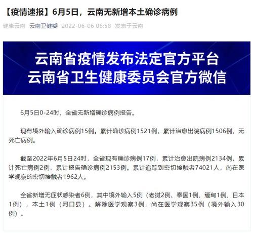 截至2022年6月5日24时,云南省现有确诊病例17例,累计治愈出院病例2134例,累计死亡病例2例,累计报告确诊病例2153例。累计追踪到密切接触者74021人,尚在医学观察的密切接触者1962人。