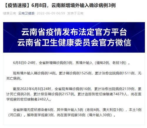 6月8日0-24时,云南省新增确诊病例3例,系境外输入(缅甸2例、老挝1例)。