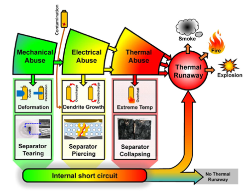 锂离子电池热失控的典型特征[3]。锂离子电池有三种典型的滥用模式:机械滥用、电滥用和热滥用。三种滥用模式有时会相互关联,最终都有可能导致电池起火和爆炸。
