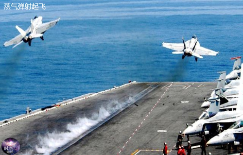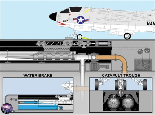 蒸气弹射系统的主要流程是通过一套蒸汽弹射器,用高压蒸气推动活塞带动轨道上的滑块,把连接在滑块上的舰载机弹射出去,2秒钟内可达到起飞速度。