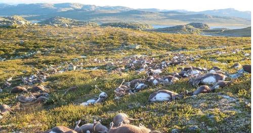 2016年,在挪威的一个小山村里,曾经出现了令人震惊的一幕:323只野生驯鹿的尸体漫山遍野。鹿群被雷电击中以后,有1/5的驯鹿并没有立刻死亡,但是受重伤无人抢救的它们,也很快死亡了。