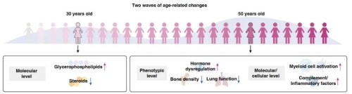 受试女性在30岁和50岁两个时间,衰老变化明显加剧。其中,30岁左右主要表现为代谢水平的脂质累积和类固醇减少。50岁左右时,身体器官、细胞和分子等多个层面变化巨大。