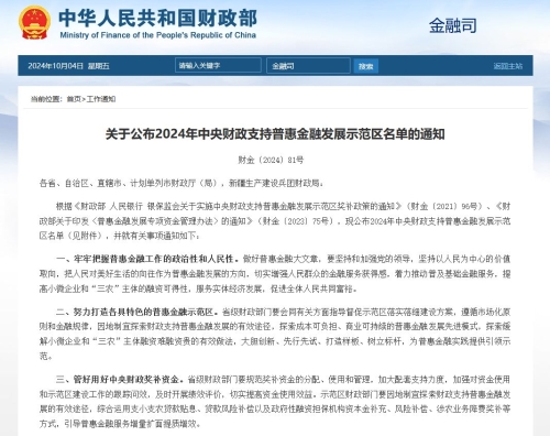 关于公布2024年中央财政支持普惠金融发展示范区名单的通知