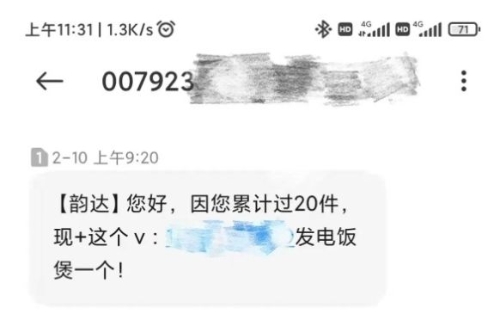 2月,市民王某收到短信,内容是:“您好!因您使用某某软件,累计收件过20件,赠您电饭煲一个!”。