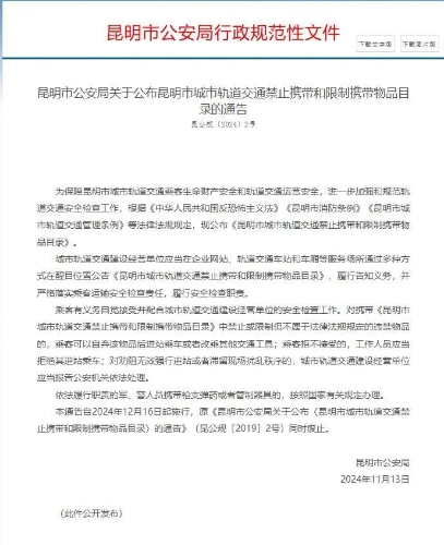 据文件显示,通告自2024年12月16日起施行,原《昆明市公安局关于公布〈昆明市城市轨道交通禁止携带和限制携带物品目录〉的通告》(昆公规〔2019〕2号)同时废止。