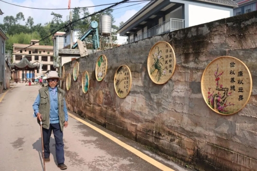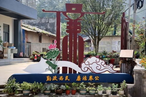 来到社区居委会前,“勤政为民 廉洁奉公”的景观小品吸引着人们的目光,一个艺术“廉”字在阳光下拉长了影子,一条独具匠心的“廉洁巷道”延伸入村,展示着竹编圆筛上的清廉小语和清廉绘画。