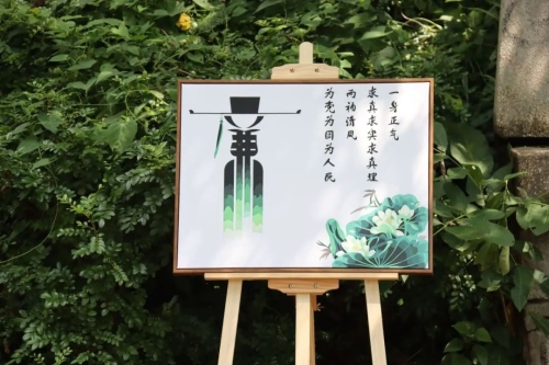 清晨的清风亭一片祥静,村民们在此休憩,读一读古今廉洁故事,亭前由竹片组成大大的“廉”字与两个红军卡通人偶相得益彰,竹的坚韧、木的敦厚,与清廉的品格天然契合。廉洁格言与历史箴言巧妙地融入巷壁,让村民、游客在熟悉的村道转角,于凉亭休憩处便能邂逅清廉思想的无声滋养。
