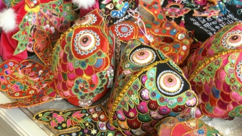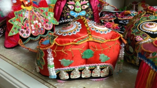 大鱼帽的制作可追溯至清代,帽身以绸缎为底,用铺针绣、扭针绣等十余种传统针法绣制鱼头、鱼尾,辅以金线勾勒鳞片,亮片点缀鱼眼,色彩以红、黄、黑、绿为主,寓意“年年有余”“长命百岁”。李竹英回忆说“我外婆那一辈,孩子满月、周岁时,长辈都要送一顶大鱼帽,这是最珍贵的礼物。”