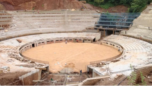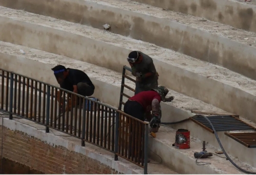 走进项目建设现场,一派火热的施工景象扑面而来,核心区域内,造型独特的斗牛场观众席已初具规模,工人们分散在各个作业点,有的忙着焊接外立栏杆,有的专注安装内部设施,还有的正在对楼梯外墙进行粉刷,每一道工序都有条不紊推进。据了解,自7月进场施工以来,项目团队直面雨季施工不便、多工种交叉作业等难题,通过不断优化施工方案、细化工期节点,目前一期主体结构和配套基础设施均在紧锣密鼓建设中,全力确保按期交付。