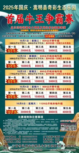 10月1日-5日,精选百头“斗士”,按体重分阶,每天不同组别精彩对决,角力、顶撞、腾跃……上演最野性的力量美学!830公斤野牛组、630公斤纯本地牛组等轮番上阵,冠军最高奖10万元!