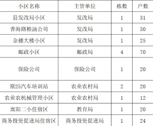 项目共涉及县发改局小区、香海路粮油公司、金穗大楼小区、邮政小区、保险公司、原25汽车培训站、农业农机管理小区、嵩阳二小住宿区、商务投资促进局住宿区9个小区,共15栋252户,总建筑面积25570平方米。