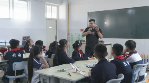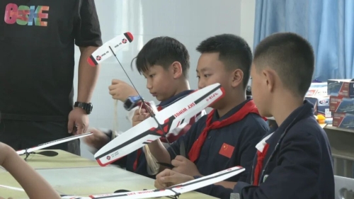 在学校科技活动室,科学老师段超然正在给同学上们讲解初级橡皮筋动力飞机模型的制作,同学们听得聚精会神,随后领取机身支架、螺旋桨、橡皮筋等制作材料包进行组装,大家一边思考老师讲解的内容,一边动手尝试拼装。模型制作完成后,大家来到室外进行飞行测试,在老师的指导下,一次次尝试、一遍遍调整,现场洋溢着探索与欢乐的氛围。