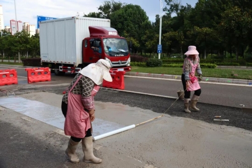 在兰茂大道,工人们正奋力将开挖路面用混凝土铺平,待混凝土平整好后,便在路面铺上保护隔离膜。