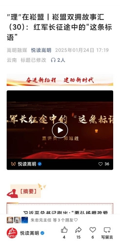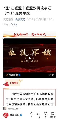 为深入开展好双拥和全民国防教育工作,县委宣传部联合县退役军人事务局,与县延安精神研究会、县融媒体中心深入挖掘拥军典型和献身国防事迹,制作《崧盟双拥故事汇》视频集,以“身边人讲身边事”的方式展播,宣扬军民团结传统,厚植家国情怀,强化全民国防意识。