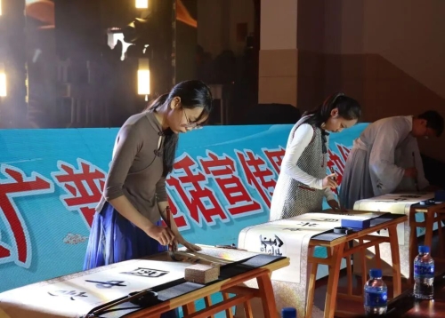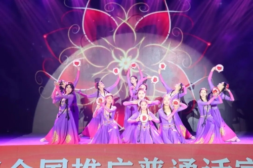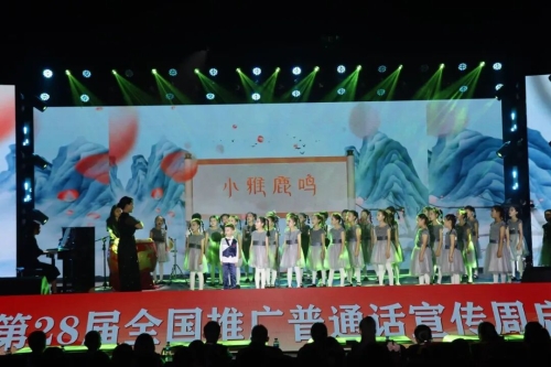 情景表演《吾乡吾言》拉开文艺展演的序幕,清越的童声穿越千年时光,悠扬古调婉转流淌,生动诠释出普通话的不朽渊源;《墨韵》书法展示环节,张军政、杨凤林两位老师与两名学生同台挥毫,笔墨在素绢上游走,书文明之信约,民族之誓言;歌伴舞《留客歌》尽显云南民族风情,各族文化在语脉交融中绽放璀璨光彩;情景对话《未来已来》全国青少年无人机大赛冠军龙保小学学生团队,现场操控无人机飞跃,精准指令对话蓝天,描绘科技与梦想交织的美丽画卷;戏曲课桌舞《梨园春晓》创意十足,少年们以课桌为砚、童心作笔,踏歌起舞,灯韵声声里,普通话与国粹艺术交相辉映、共生共荣……16个节目轮番上演,既蕴含深刻的教育意义,又彰显浓郁的文化魅力。
