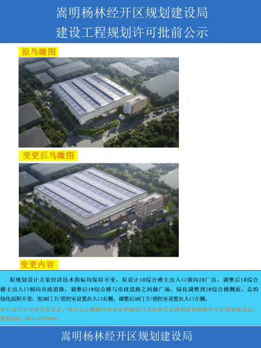 原规划设计方案经济技术指标均保持不变。原设计1#综合楼主出入口朝向2#厂房,调整后1#综合楼主出入口朝向市政道路,调整后1#综合楼与市政道路之间做广场,绿化调整到1#综合楼侧面,总的绿化面积不变,原3#门卫/消控室设置在入口右侧,调整后3#门卫/消控室设置在入口左侧。