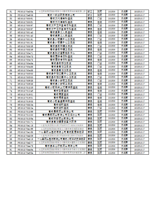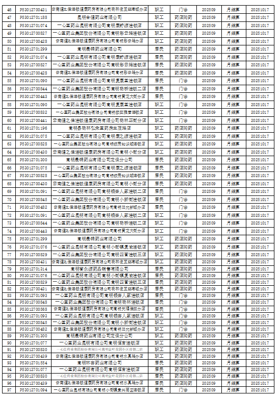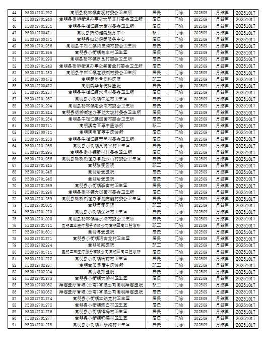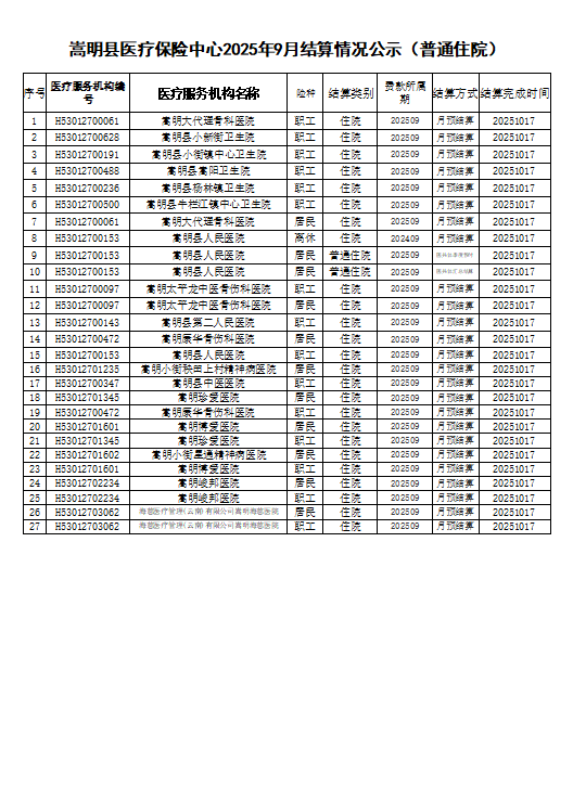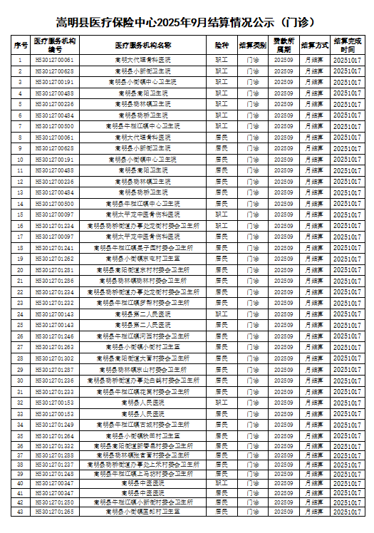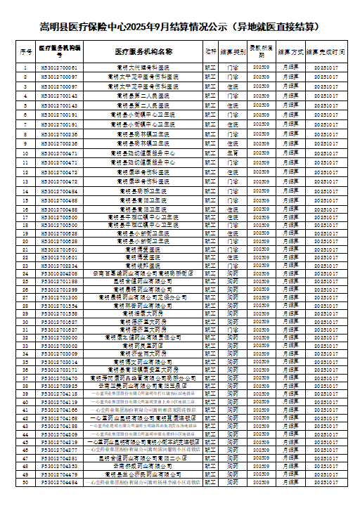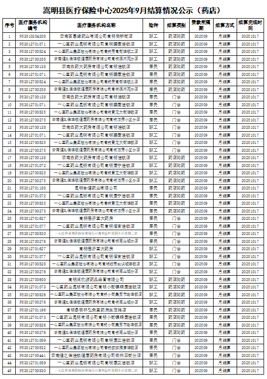 根据相关工作要求,现将2025年9月嵩明县定点医药机构费用结算情况公示如下: