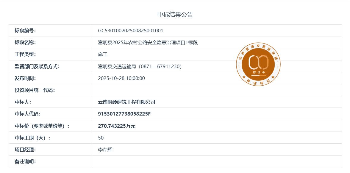 嵩明县2025年农村公路安全隐患治理项目1标段(中标结果公示)