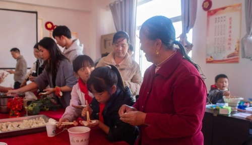 当第一份热气腾腾的饺子出锅,由学校和社区领导带队,细心打包好,挨家挨户送到社区的长者手中。