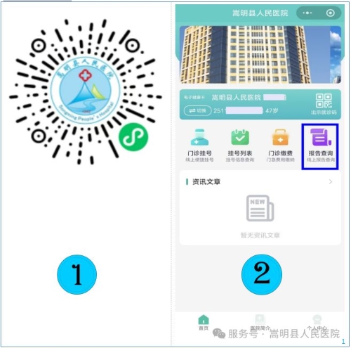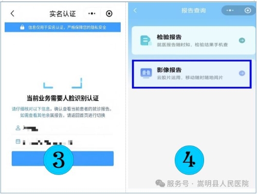 方法2:搜索进入“嵩明县人民医院”微信小程序,进入“报告查询”菜单,完成人脸识别认证后即可查看检验、检查报告以及影像报告和图片。