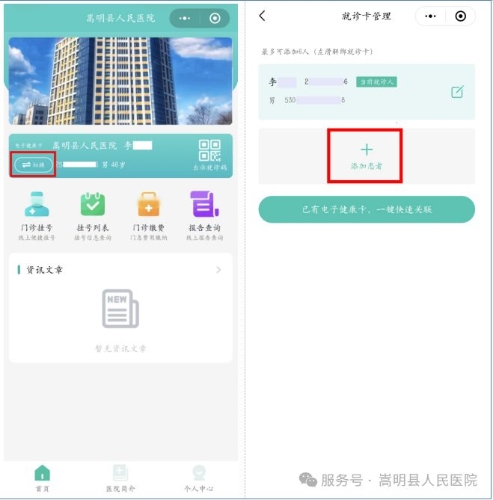 未使用智能手机的老人和小孩,建议您通过“嵩明县人民医院”微信小程序将他们添加在您名下的就诊卡中,既可进行检验报告和电子胶片的查询,也便于挂号、缴费。