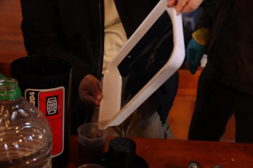 紧接着进入停显水洗环节,要以清水灌入显影罐并倒掉,如此重复三次,之后将相片放入盘中再次倒入显影液,最后还需用清水冲洗,让显影液充分发挥作用又彻底清除残留药剂。在纪一兵的指导下,部分参与者亲自上手操作,从装片到倒液,从计时到冲洗,每一个步骤都小心翼翼,沉浸式感受“光影作画,银盐显影”的神奇。