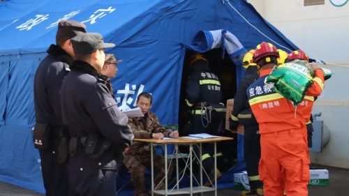 车队抵达安置点后,车辆有序停放在指定区域。应急人员立即投入卸货工作,大家协力将大米卸载至临时堆放点,并现场进行二次清点核查。在粮食发放区,现场已模拟设置了领取点位,公安干警在周边维持秩序,确保环节安全有序。工作人员进行名册核对与登记工作,模拟受灾群众及救援人员有序排队领取。