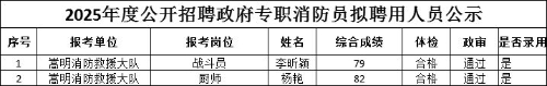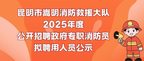 根据工作需要,昆明市嵩明县消防救援大队2025年度公开招聘政府专职消防员,经报名、资格审查、体测、岗测、心理测试、笔试、面试、体检、政治考核等程序,已确定拟聘用人员。根据《昆明市消防救援支队2025年政府专职消防员招聘公告》相关规定,现将2025年度公开招聘政府专职消防员拟聘用人员予以公示。公示时间:2025年12月17日至12月23日(5个工作日)。