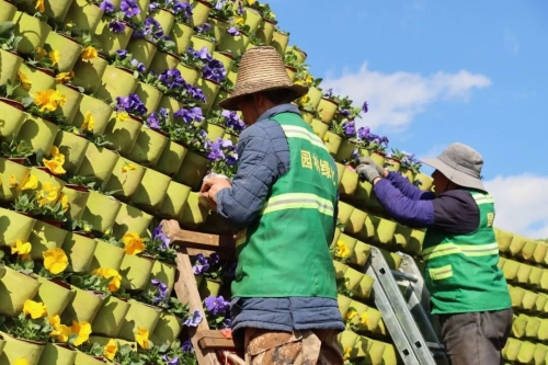 同一时间,兰茂路上,工人们也在同步进行花卉更换工作。一盘盘盛放的三色堇正从车上卸下,逐盆置入“兰茂·滇南本草”花墙,紫黄相间的花朵拼成不同图案,与绿化带里的绿植互相点缀,高低错落,富有层次感。“本次更换花卉是为了迎接元旦、春节的到来,县城的花卉一般是三到四个月换一次,尽量兼顾到节假日的氛围营造。”县综合行政执法局的工作人员介绍。