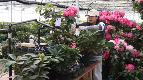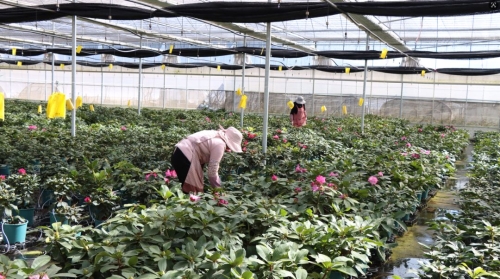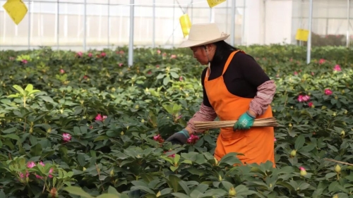 相较于进口品种,嵩明本土培育的高山杜鹃虽在花型规整度上略有差距,但胜在适应性更强、成活率更高,更契合南方地区以及北方室内的养护环境。目前,北方室内温度恰好适配高山杜鹃开花需求,而该品种在北方原生稀少,加之耐寒性突出,可耐-15℃至21℃低温,成为北方花友的优选年宵花。同时,基地通过技术人为调控花期,让原本三四月份开放的高山杜鹃提前绽放,春节期间即可赏花,满足市民年宵花消费需求。