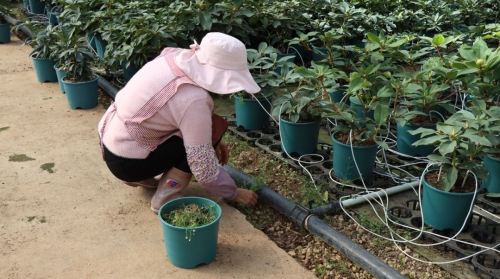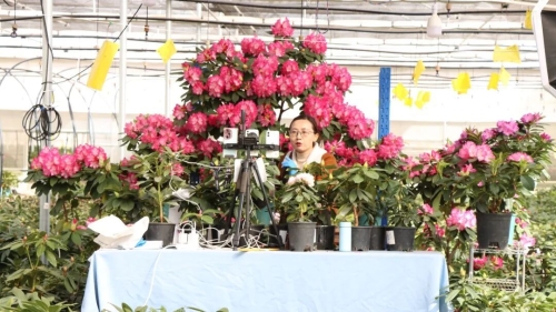 1月4日,记者走进位于嵩阳街道山脚社区的嵩明浩丰园林绿化工程有限公司高山杜鹃培育基地,大棚内,工人们在浇水除草,电商主播在直播带货,向客户推介嵩明本土培育的高山杜鹃,现场一派产销两旺的红火景象。