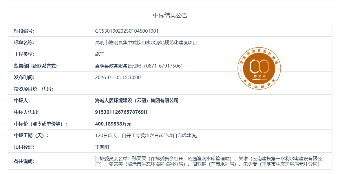 昆明市嵩明县集中式饮用水水源地规范化建设项目(中标结果公示)