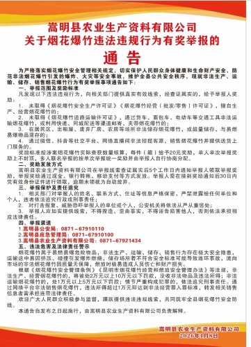 烟花爆竹违法违规行为,举报有奖!嵩明县农业生产资料有限公司→