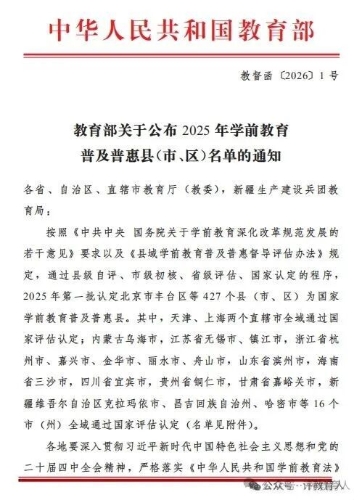 日前,教育部发布《关于公布2025年学前教育普及普惠县(市、区)名单的通知》,云南省13个县(市、区)入选,嵩明县在列。