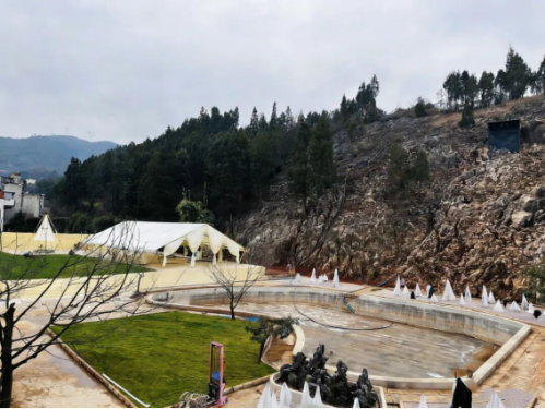 作为庄园最具辨识度的景观,依托原生山体打造的人工瀑布已完成水循环调试,进入稳定性测试阶段。水流沿山势泻落,与步道、草坪区自然衔接,形成移步换景的视觉动线。据项目负责人吴燕介绍,瀑布观景视野覆盖户外休闲区、烧烤区及火塘周边,实现“全景沉浸”,进一步丰富了望风屏景区的水景层次,有望成为游客拍照打卡的热门背景。