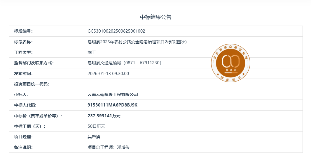 嵩明县2025年农村公路安全隐患治理项目2标段(四次)中标结果公示