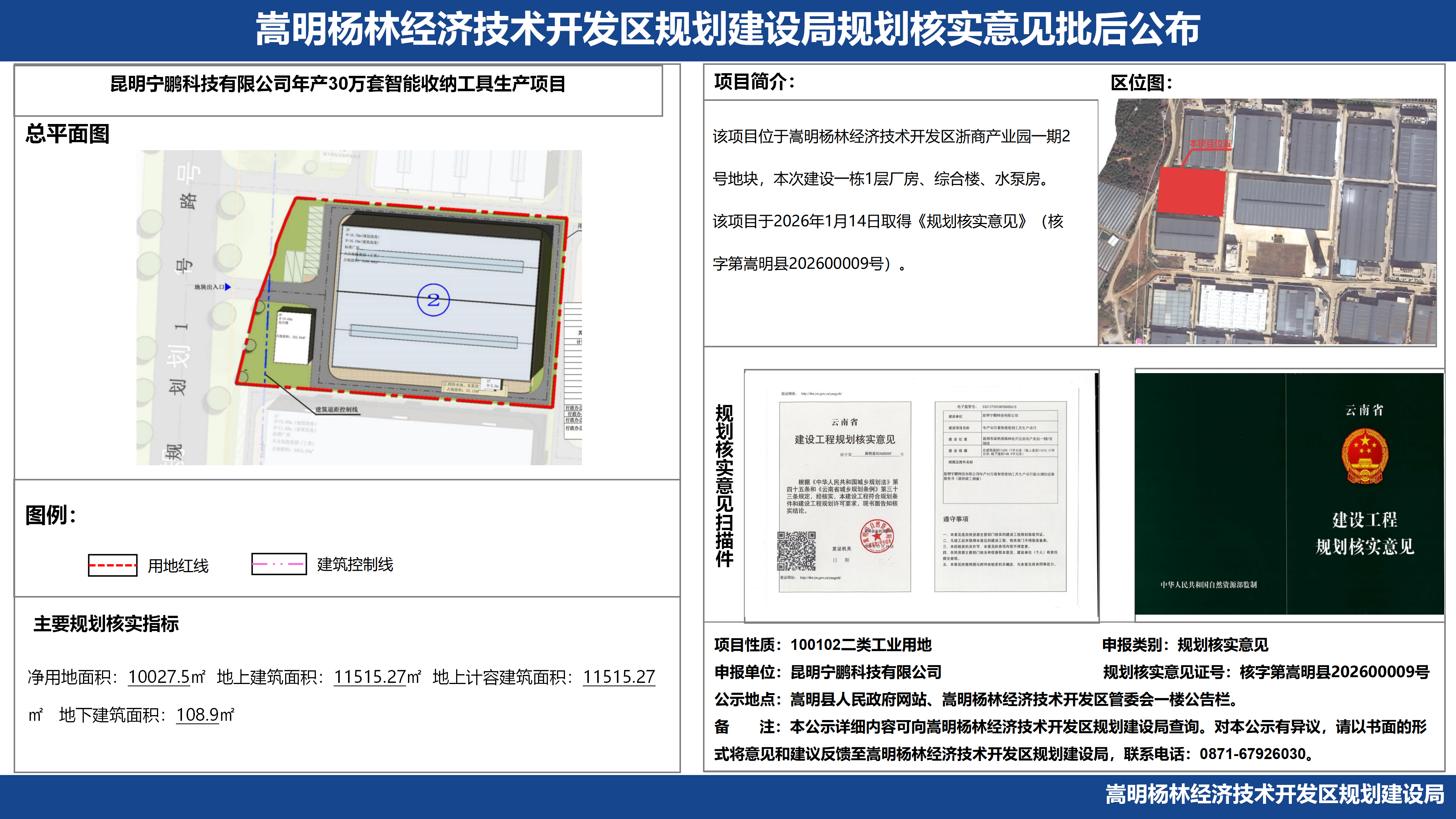 昆明宁鹏科技有限公司年产30万套智能收纳工具生产项目规划核实意见批后公布