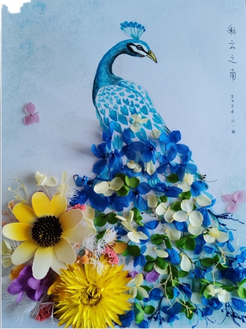 除纯露之外,绘画与仿真花艺也是她表达美好的方式。铺纸勾勒,社区春色与邻里暖景在笔下生辉;执花创作,孔雀、挂坠等永生花工艺品栩栩如生。这些凝聚心意的手工作品,常被她作为小礼物赠予社区的老人家与孩童,为平凡生活添上一抹鲜活的色彩。