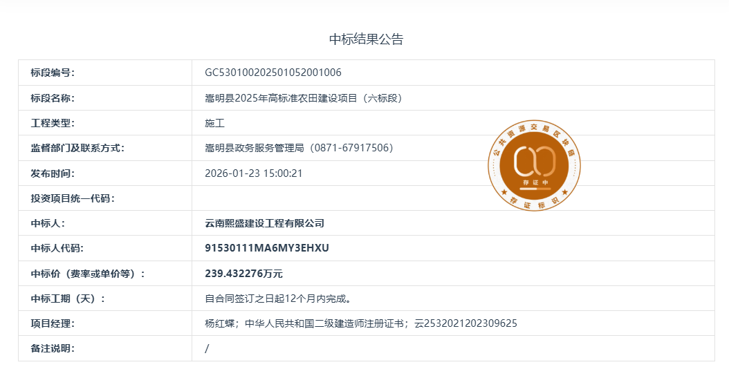 嵩明县2025年高标准农田建设项目(六标段)中标结果公示
