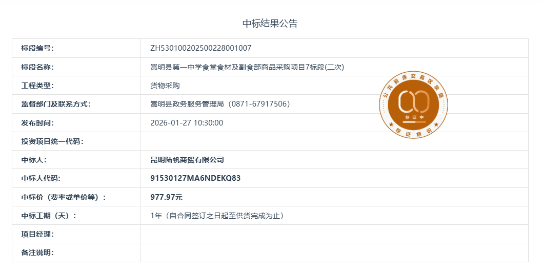 嵩明县第一中学食堂食材及副食部商品采购项目7标段(二次)中标结果公示